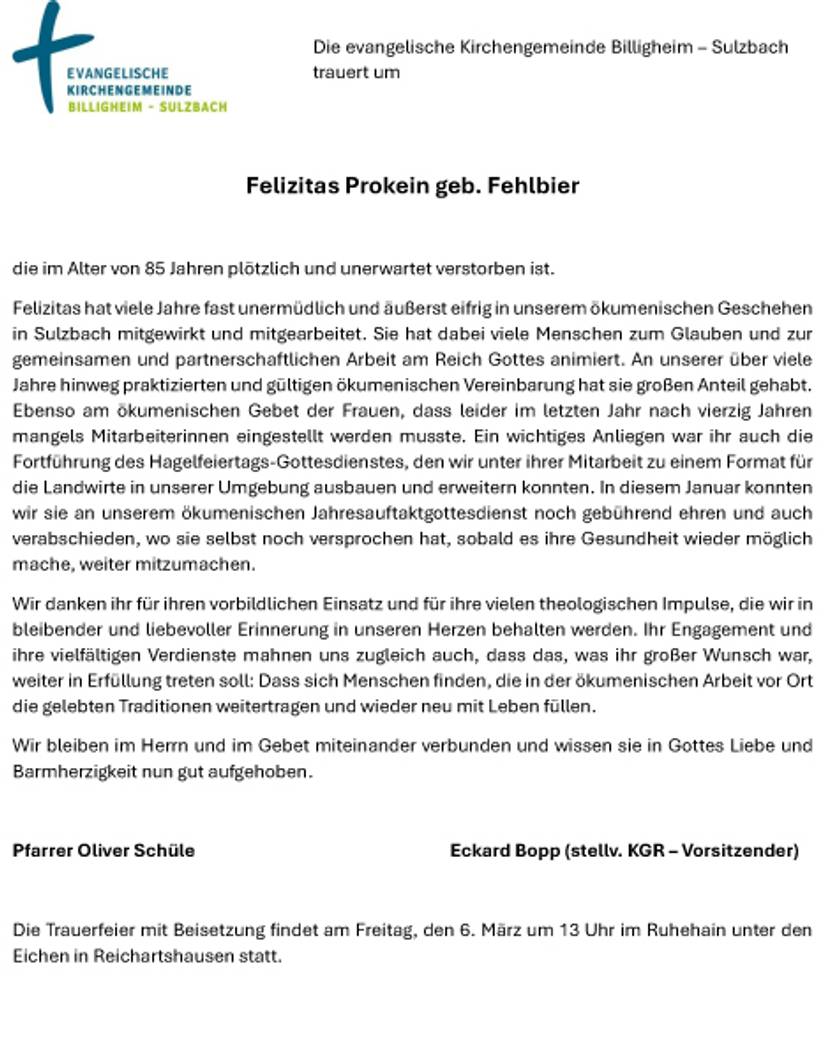 Trauer um Felizitas Prokein